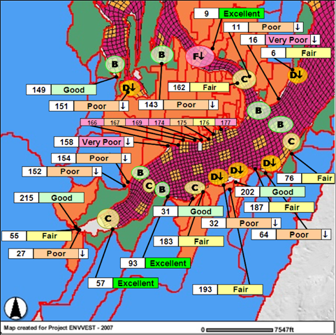 Model evaluation results for estimating FC loading from watershed DSNs (rectangles) and predicting FC concentrations at canary nodes (circles) in Sinclair Inlet during WY2003.